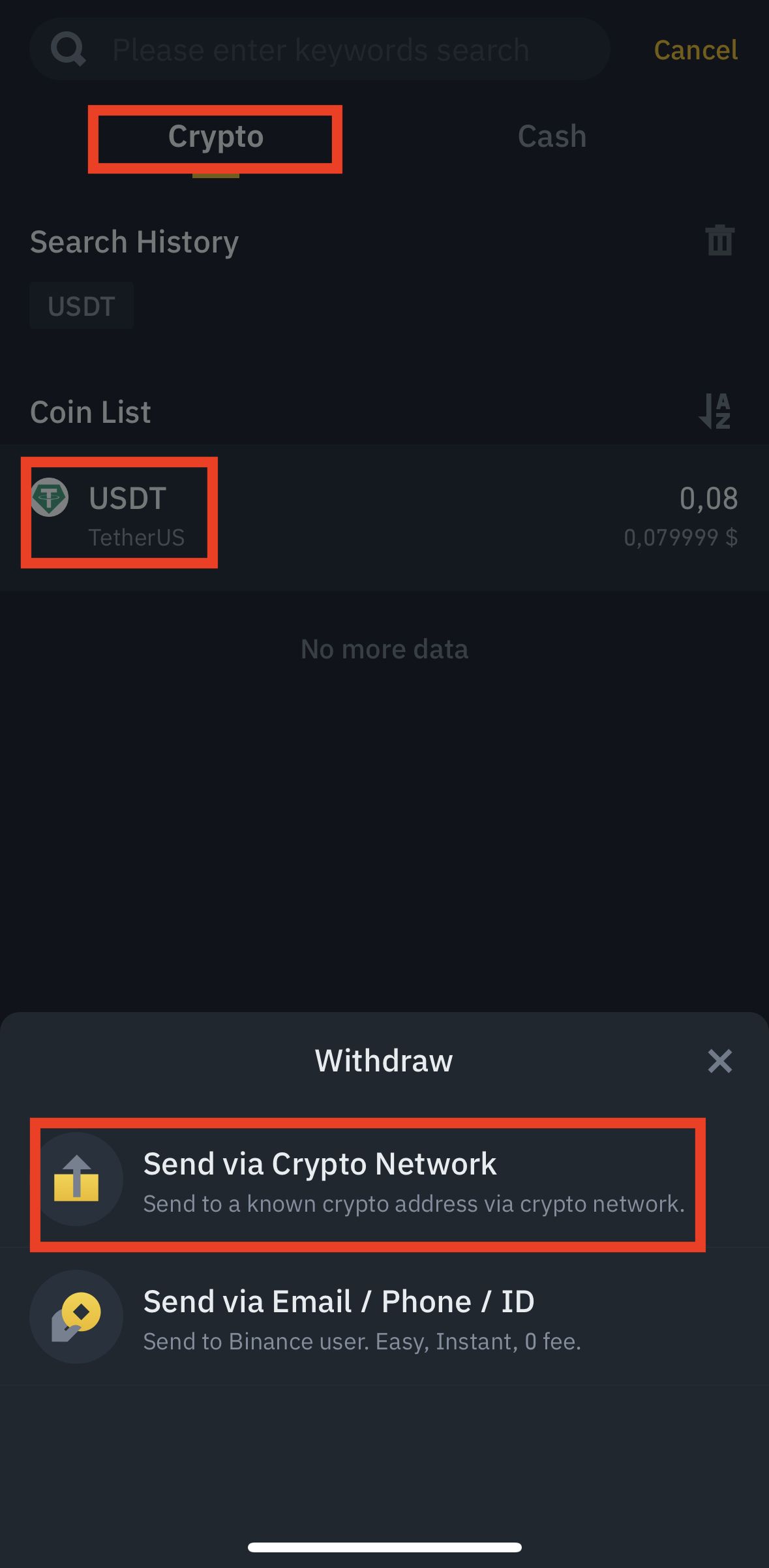 Next, choose Cryptocurrencies - USDT - Send through crypto-network.